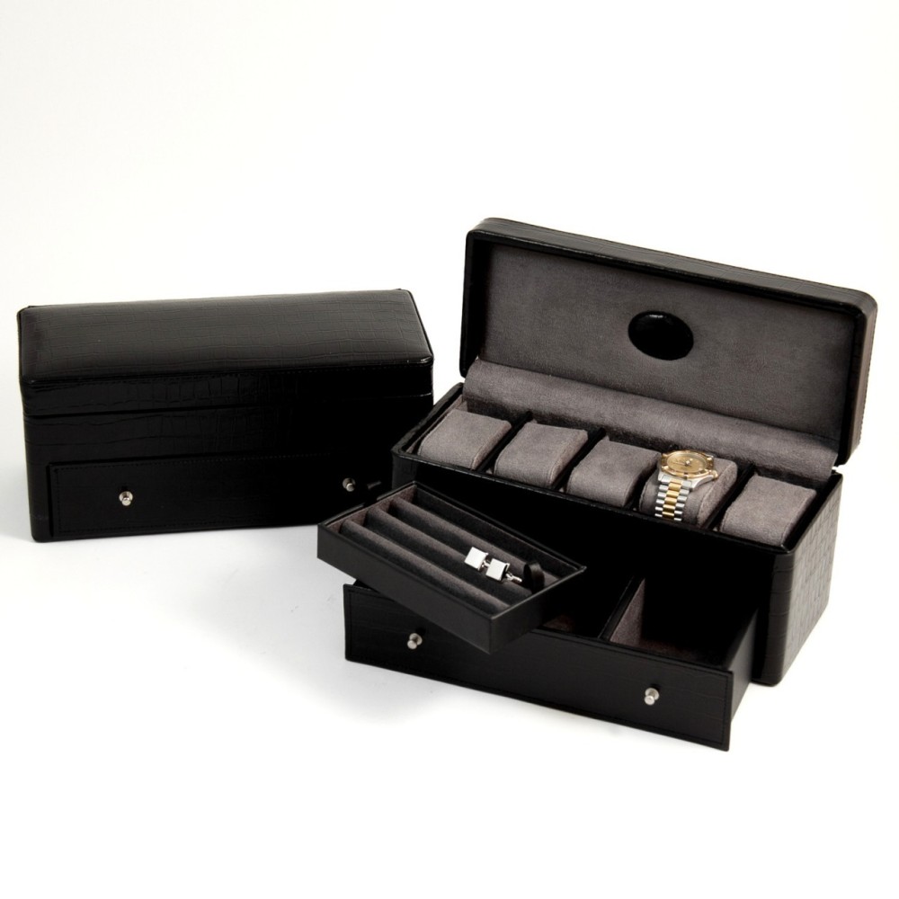 Black "Croco" Leather 5 Watch Box with Drawer for Pens and Accessories.