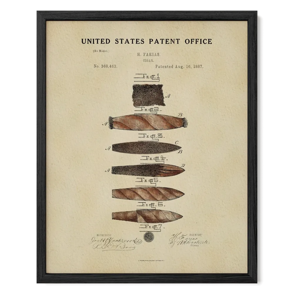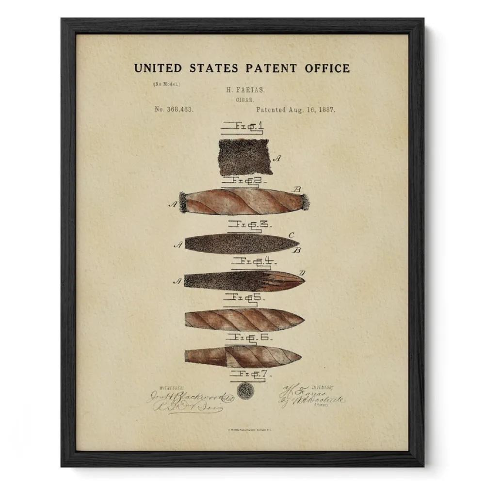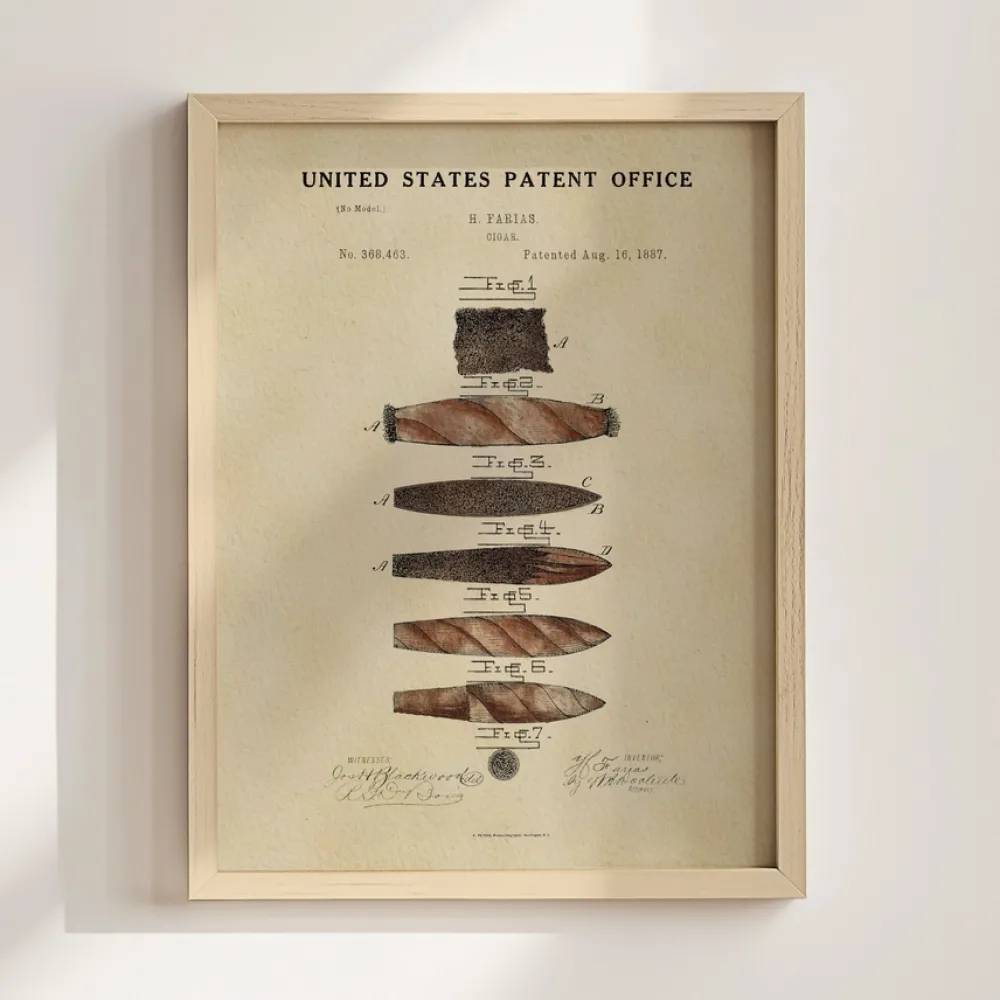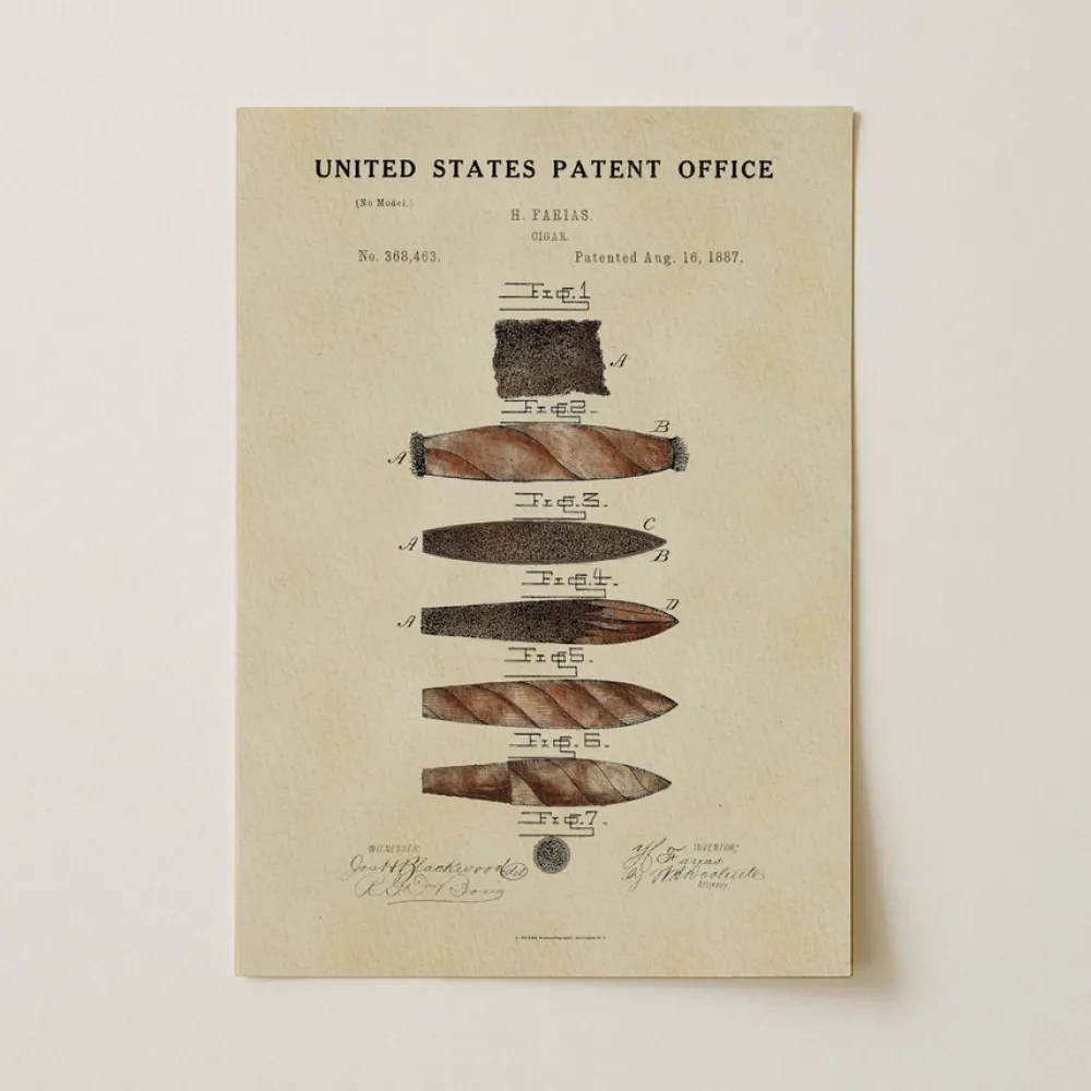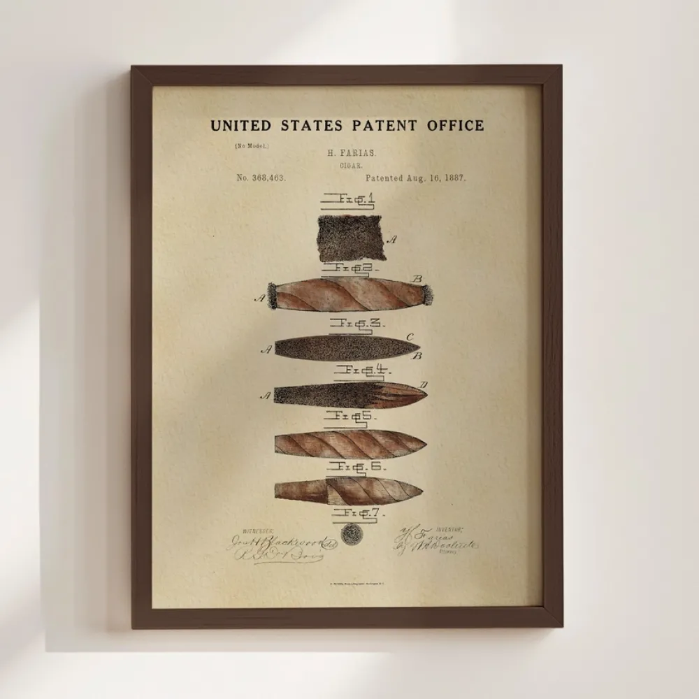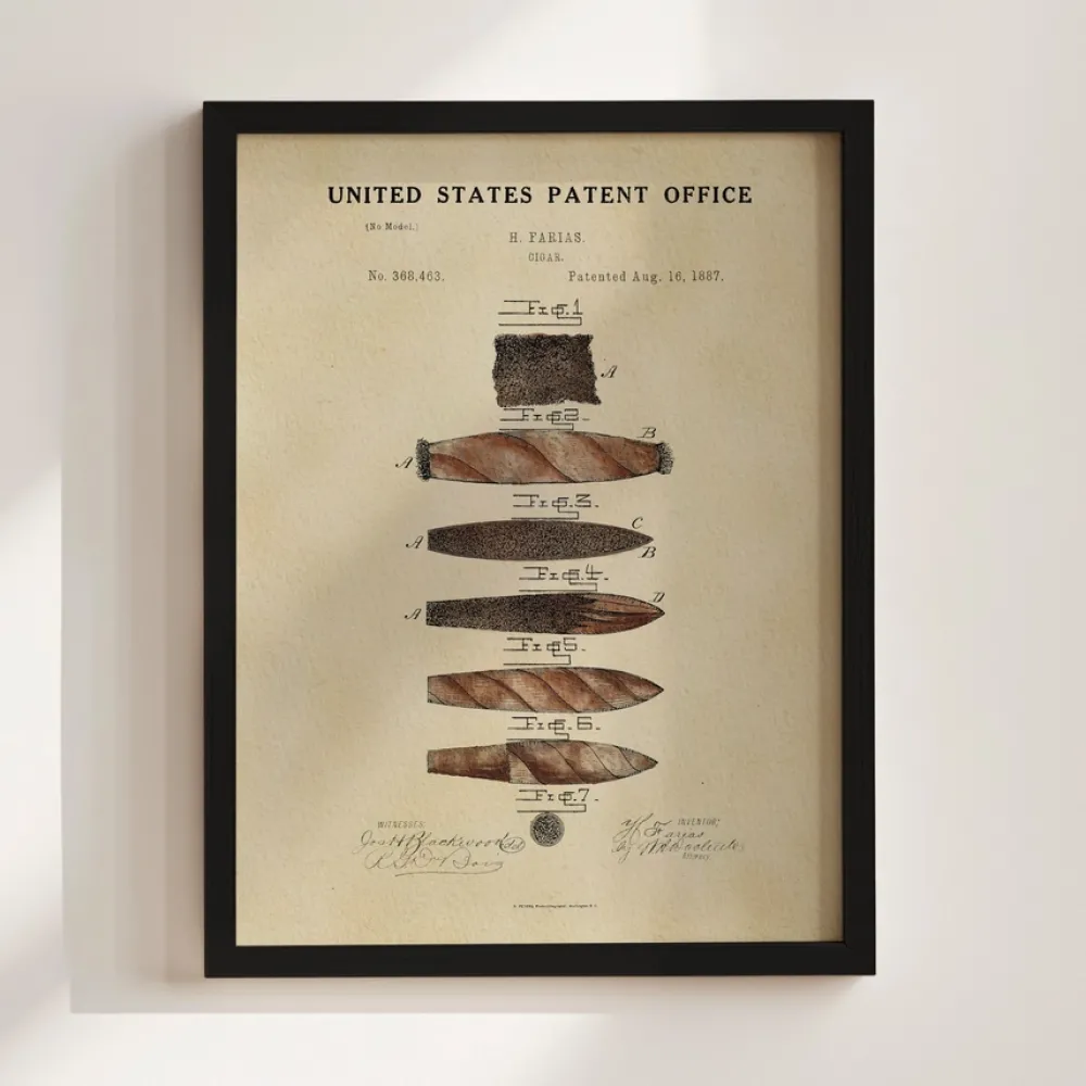 Our watercolor Cigar patent print, originally patented by Heraclio Farias in 1887, comes framed or unframed, making it the perfect gift for the cigar lover in your life. Its vintage aesthetic makes it a standout piece in any living room, office, or cigar lover's space.