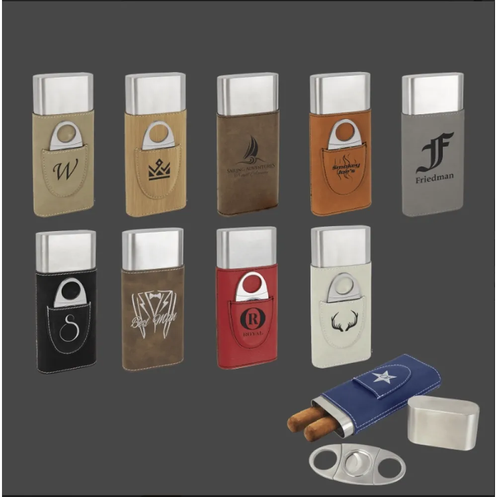 Classy cigar case with cutter, customizable with business logo or other promotional logo. Holds 2-3 cigars as well as the cutter. Leatherette wrap offers beautiful look and feel of leather at an affordable price. Lends itself well to complete customization.
