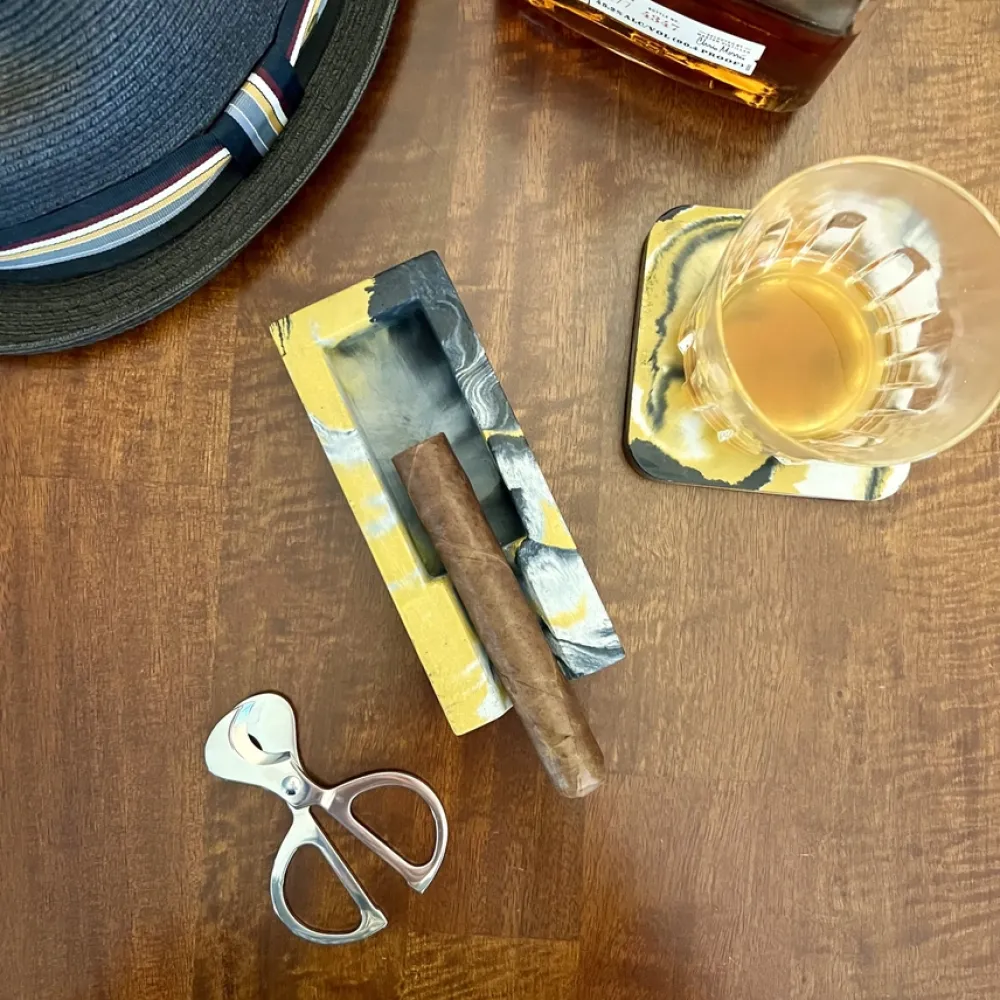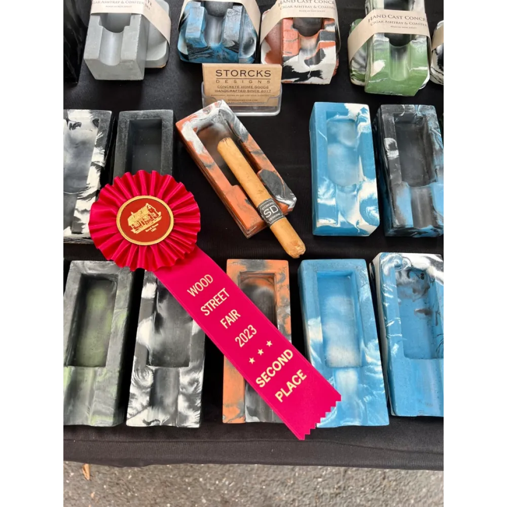 Enhance your cigar rituals with our handmade concrete cigar ashtray & coaster set — perfect for unwinding by the fire pit, enjoying a glass of bourbon, or gathering with friends. We designed the molds ourselves and hold a US Patent (D875,307) on the single ashtray, so each set is truly one-of-a-kind. Hand-poured and sealed for indoor or outdoor use, with cork bottoms to protect surfaces, easy to clean, and gift-ready in our stamped drawstring bag.