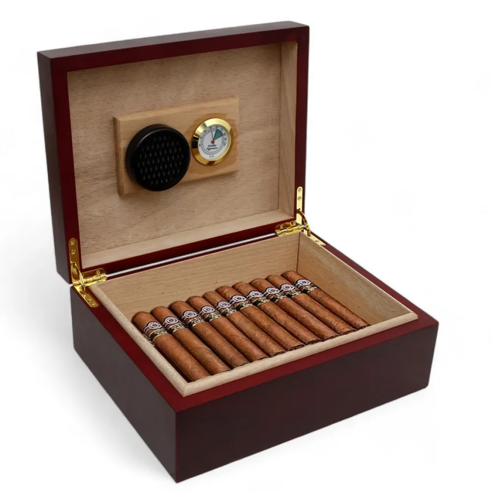 It also includes a hygrometer and a foam/sponge humidifier, including spring-loaded brass hinges and a concealed magnetic closure for ultimate freshness.