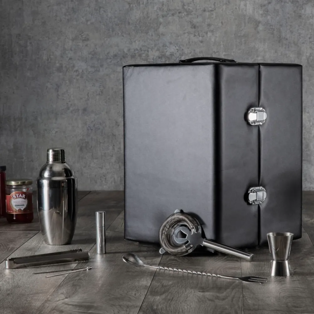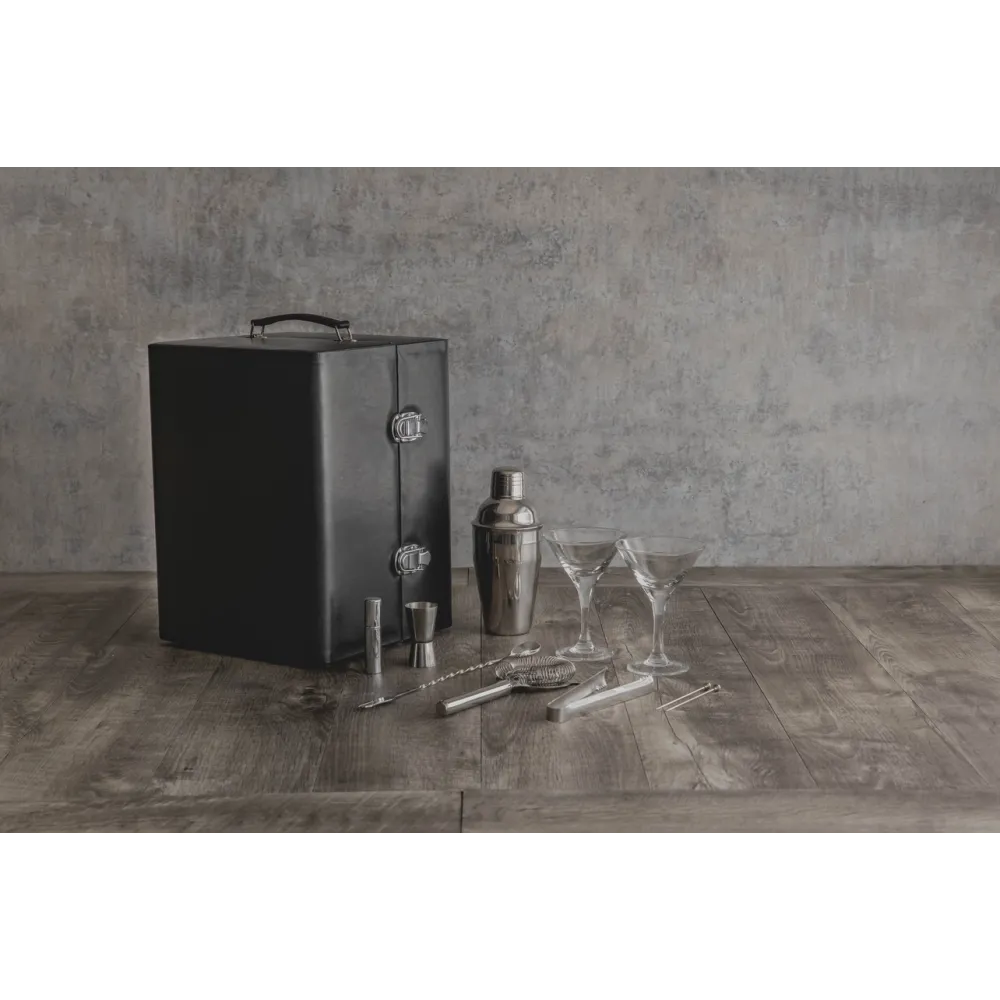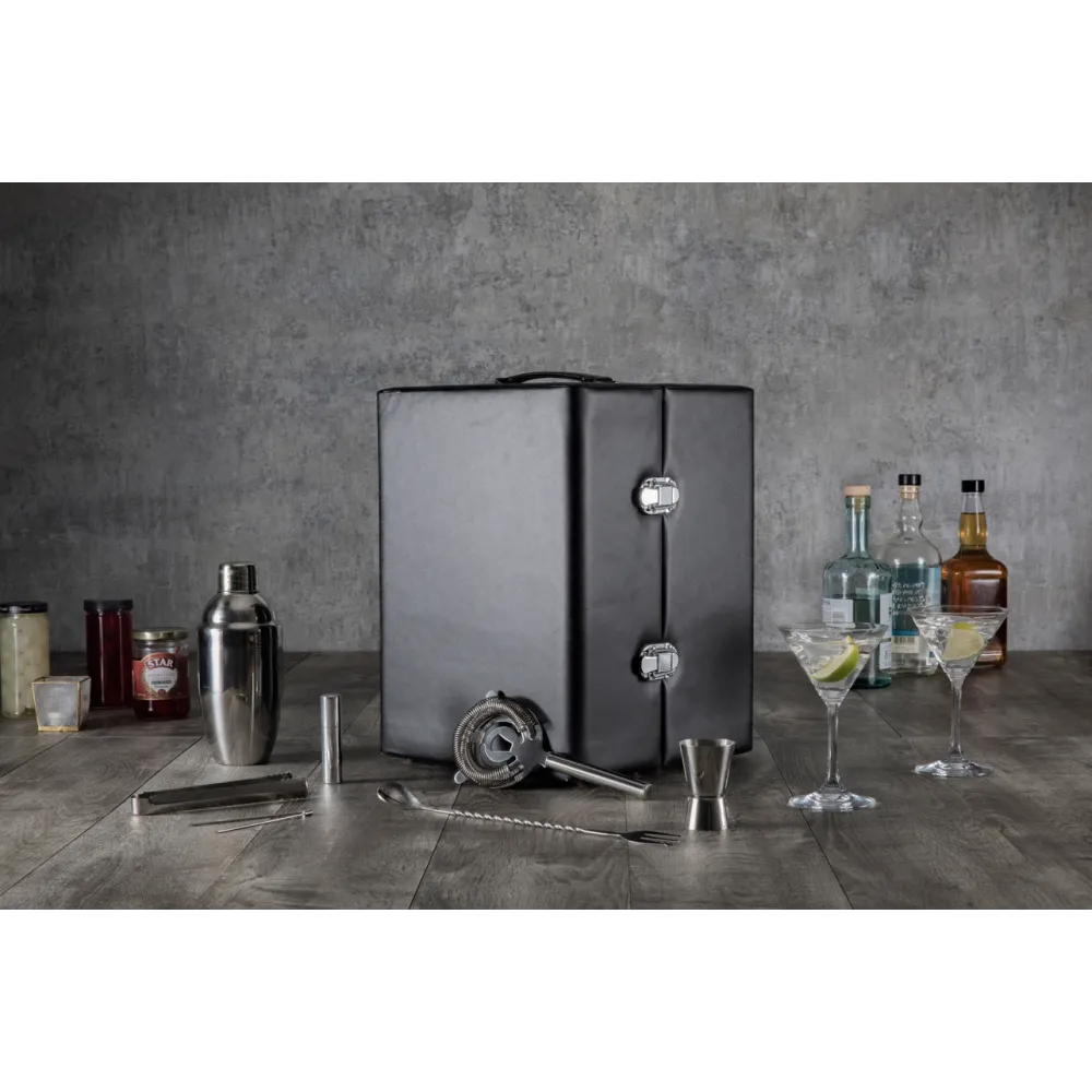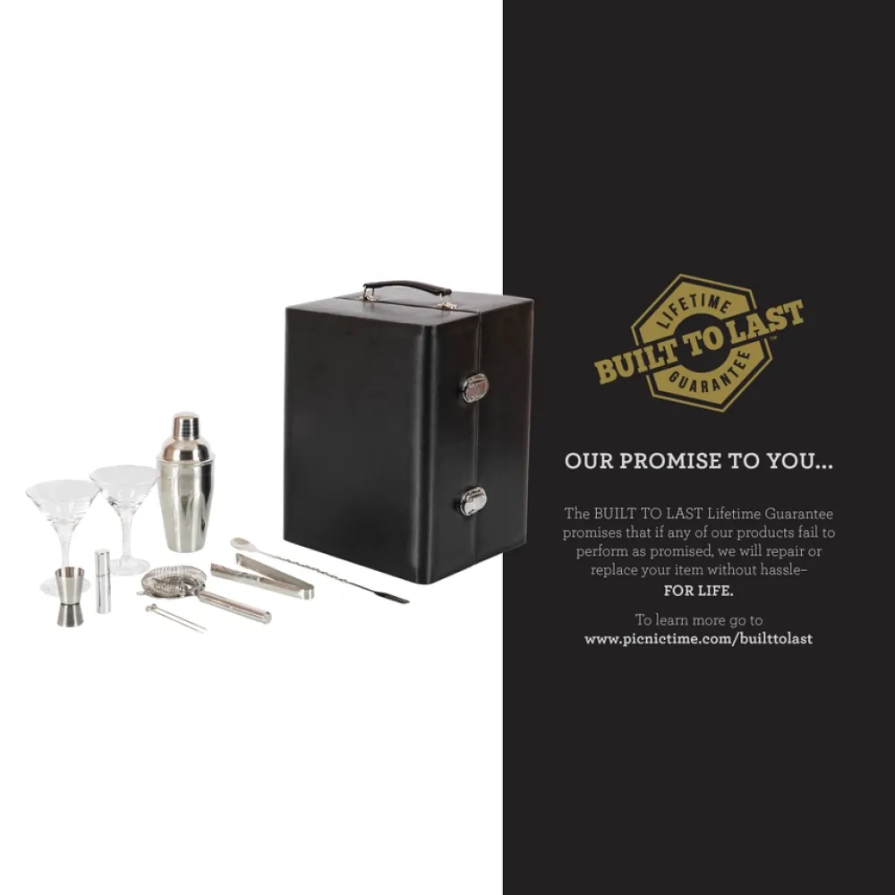 From the Roaring 20s to the 2020s, the Manhattan Portable Cocktail Set brings all that jazz back to happy hour. This complete bartender set is reminiscent of a vintage suitcase with its premium leatherette exterior and fully-insulated interior lined in sleek black velveteen which tastefully showcases your two favorite wine or liquor bottles and the included: two hand-blown 7oz. Martini glasses, stainless steel shaker, stainless steel double-sided jigger, stainless steel ice tongs, stainless steel strainer, two stainless steel olive picks, Vermouth mister, and elegant combination fork/spoon stirrer. This martini set is a handsome fixture on your home bar, or take your inner mixologist on the road, to the picnic, or on the train. Wherever you go, you'll be fabulous, dahling!