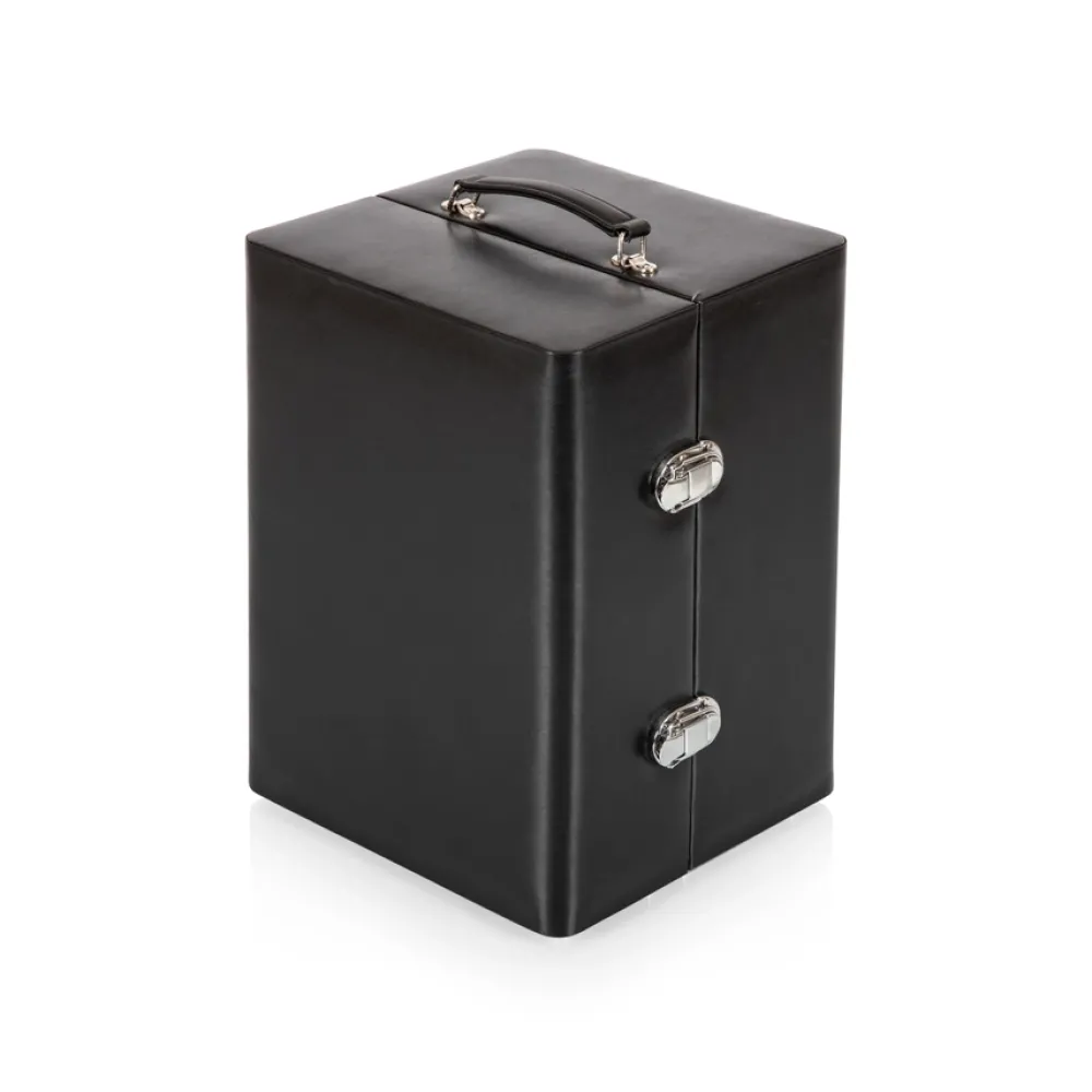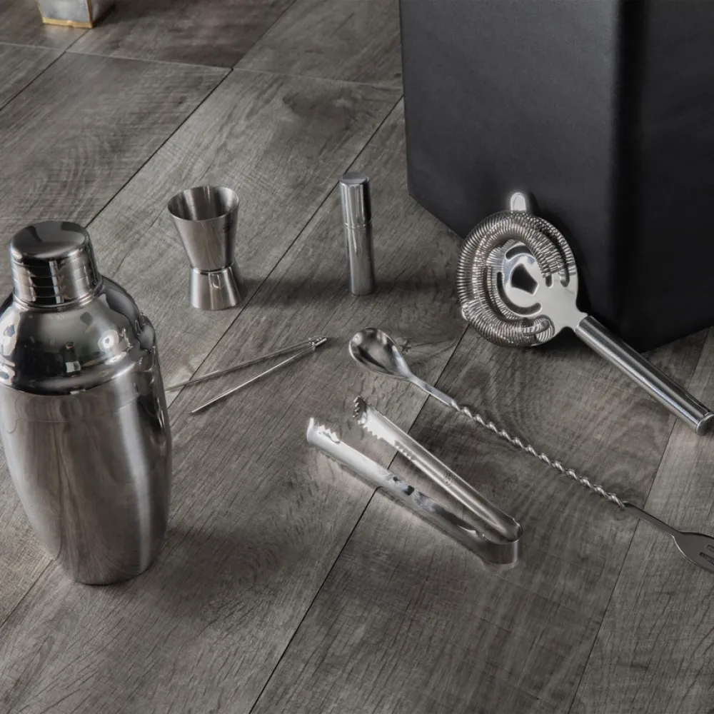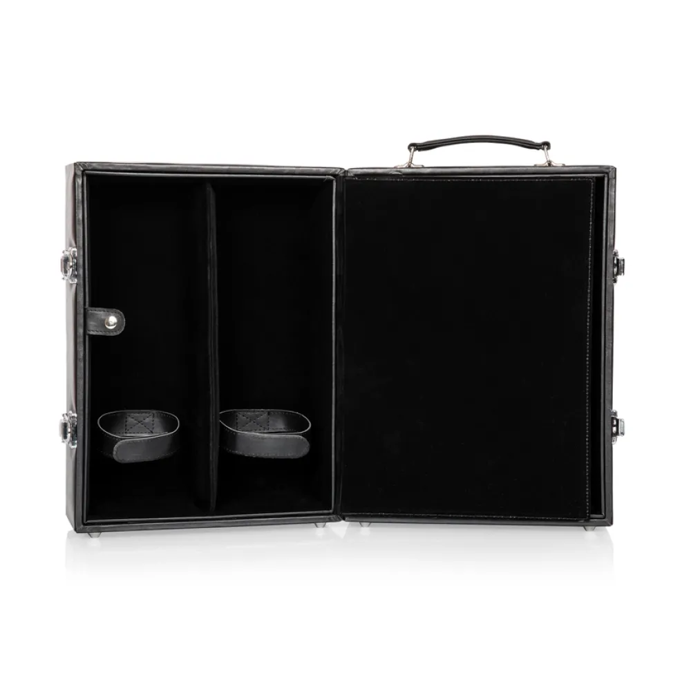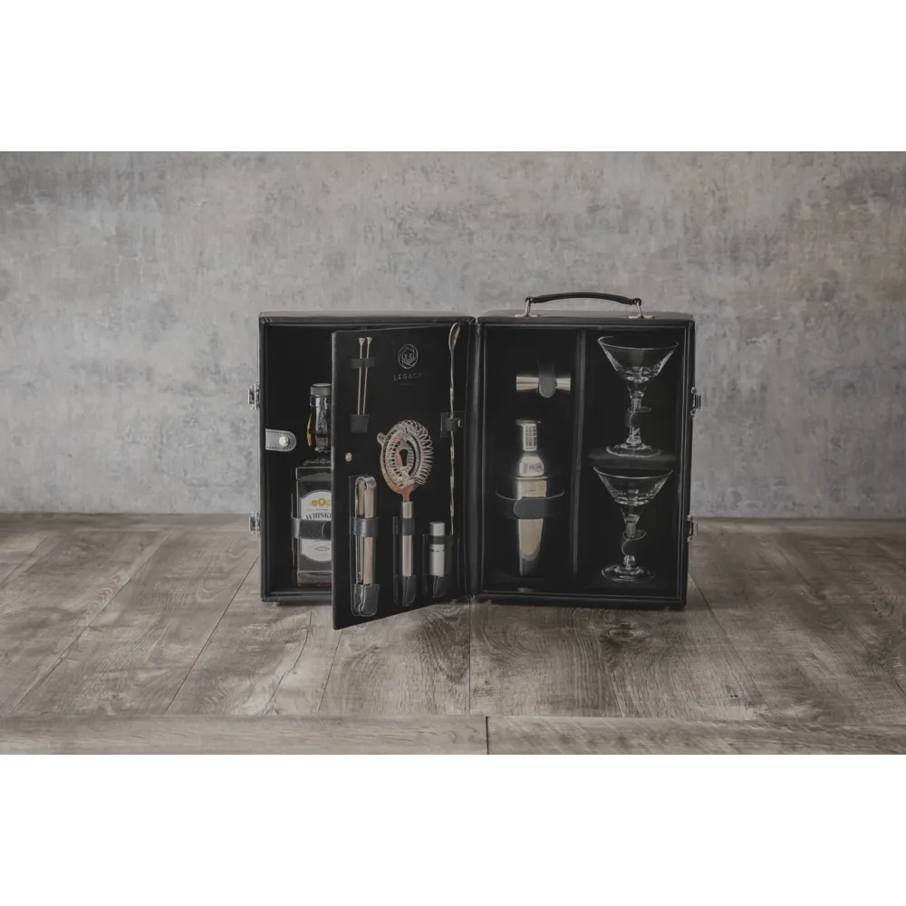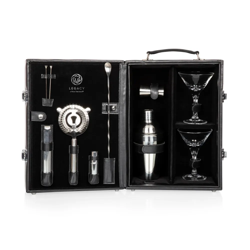 From the Roaring 20s to the 2020s, the Manhattan Portable Cocktail Set brings all that jazz back to happy hour. This complete bartender set is reminiscent of a vintage suitcase with its premium leatherette exterior and fully-insulated interior lined in sleek black velveteen which tastefully showcases your two favorite wine or liquor bottles and the included: two hand-blown 7oz. Martini glasses, stainless steel shaker, stainless steel double-sided jigger, stainless steel ice tongs, stainless steel strainer, two stainless steel olive picks, Vermouth mister, and elegant combination fork/spoon stirrer. This martini set is a handsome fixture on your home bar, or take your inner mixologist on the road, to the picnic, or on the train. Wherever you go, you'll be fabulous, dahling!