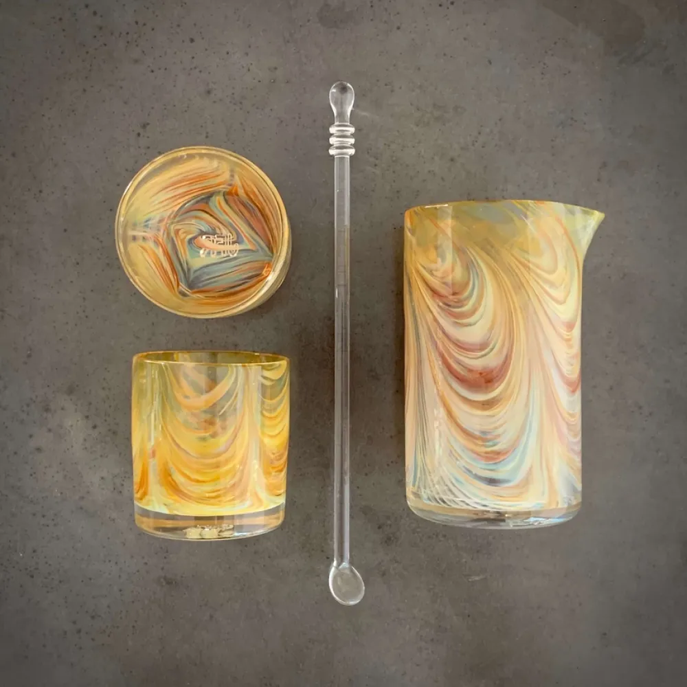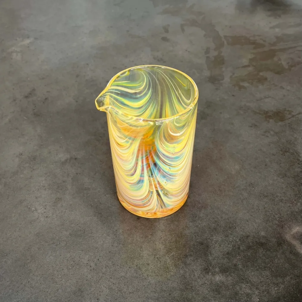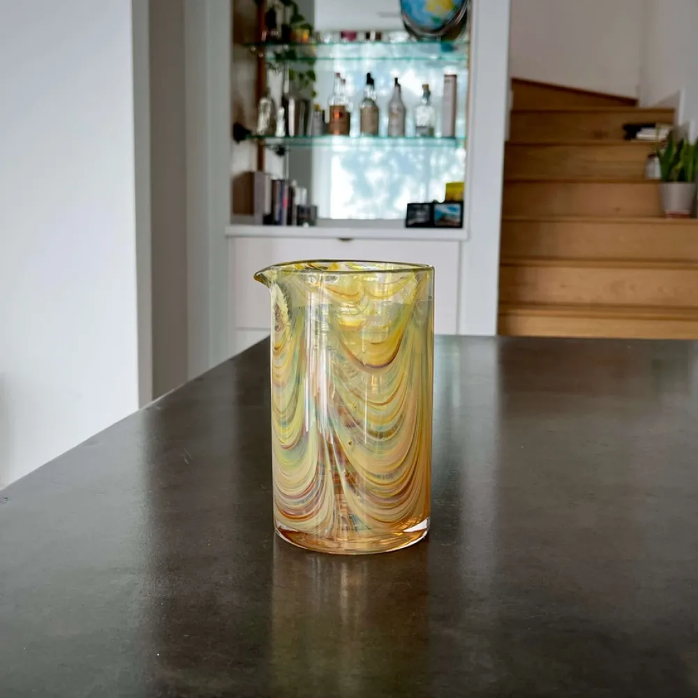 This classic Cocktail Mixing Glass is built for functionality with a sturdy base and is adorned with a beautiful multi-amber colored design capturing the beauty of wood grain. A speciality tool is used to form the spout for a smooth pour. Stirring spoons and rocks glasses sold separately***