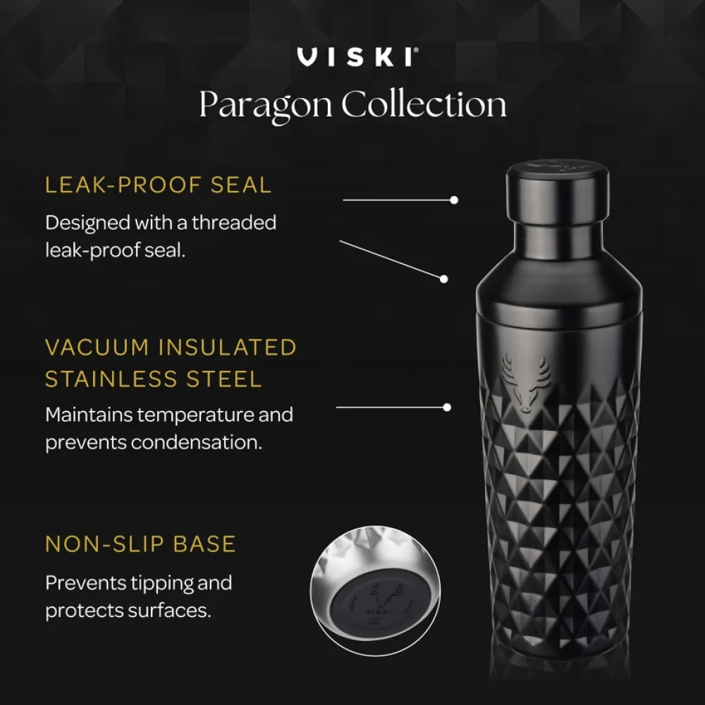 the Paragon Stainless Steel Cocktail Shaker in Obsidian seamlessly blends style and performance. Its vacuum insulated construction ensures your cocktails perfectly chilled, limits condensation, and prevents cold hands. The progressive faceted pattern ensures a secure grip, while the threaded leak-proof seal and cap’s built-in measuring lines (1-6 oz) add precision to your pours. Finished in sleek obsidian, it’s the ultimate modern bar essential.