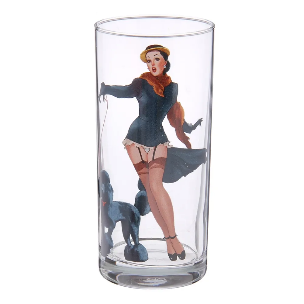 Pin-up Girls Glass Set is the set of 6 tall glasses for cold drinks. The glasses decorated with the bright image of Pin-up girls make a wonderful addition to your kitchen! Pin-up style is a retro artistic style characterized by depictions of feminine women in stylish attire, often featuring bright colors and an emphasis on female attractiveness.