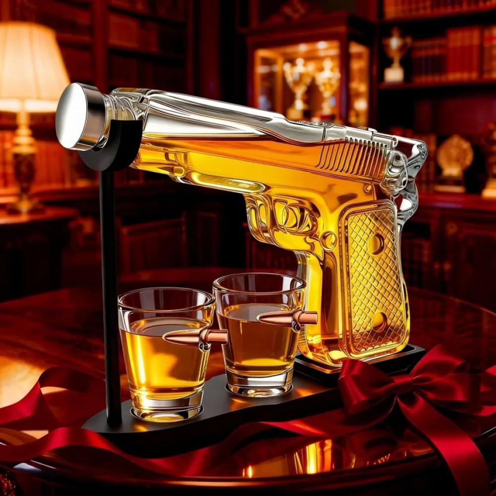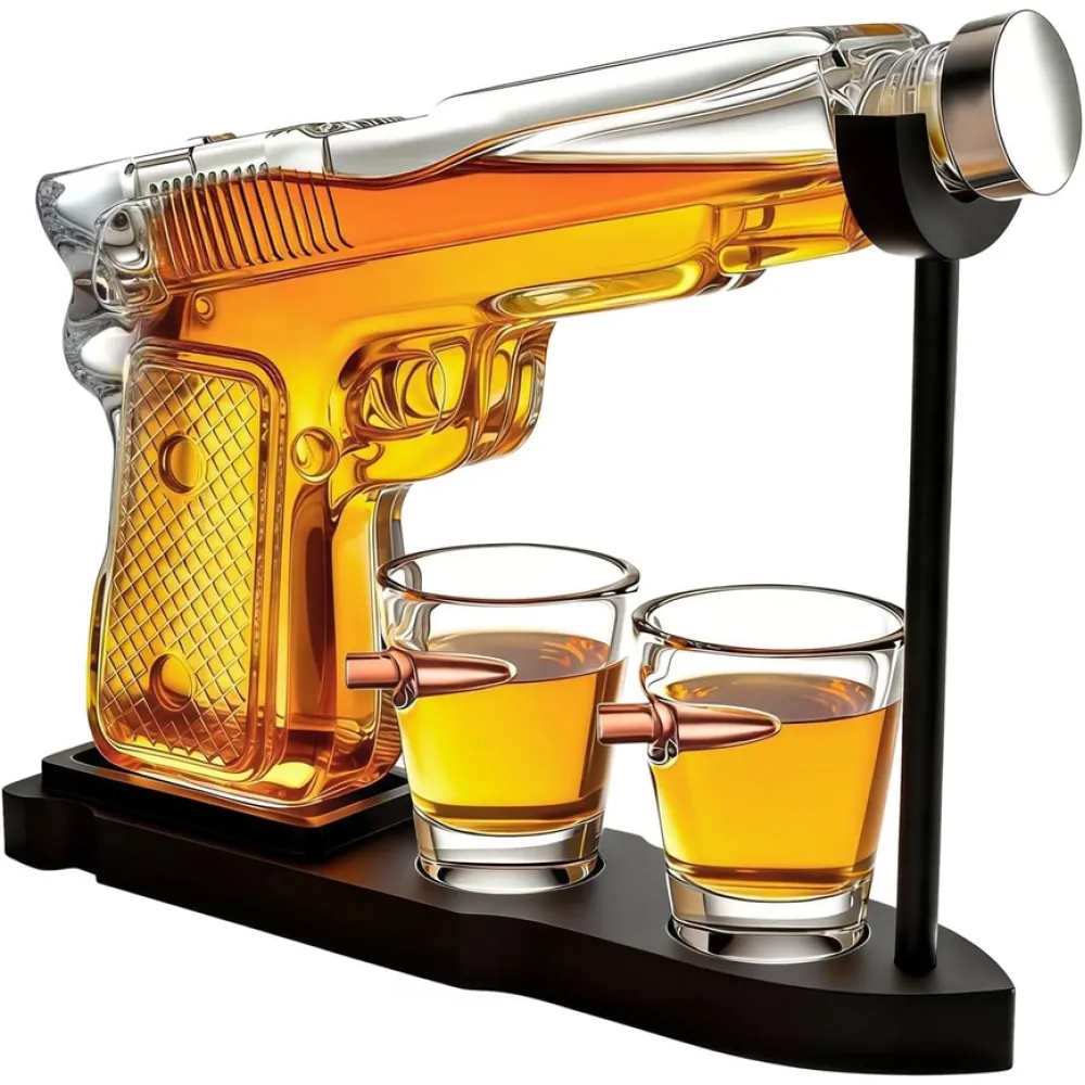Pistol Gun Decanter Set + 2 Bullet Shot Glasses & Wood Stand