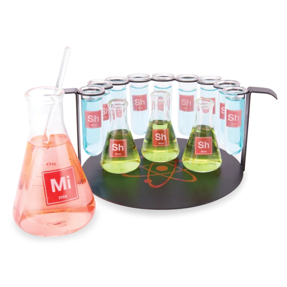 Where scientific novelty meets spirited fun, this unique shot glass set transforms your home bar into a captivating laboratory for crafting creative cocktails. Featuring test tube shot glasses and Erlenmeyer flask vessels, it's an epic addition to any drinks enthusiast's collection and a fantastic gift for science lovers. A convenient serving rack stylishly presents your concoctions to guests, making it perfect for chemists, lab aficionados, and anyone who appreciates distinctive barware. Surprise your nerdy friends or family who love to host with this unforgettable gift and get ready to concoct your own signature spirits!