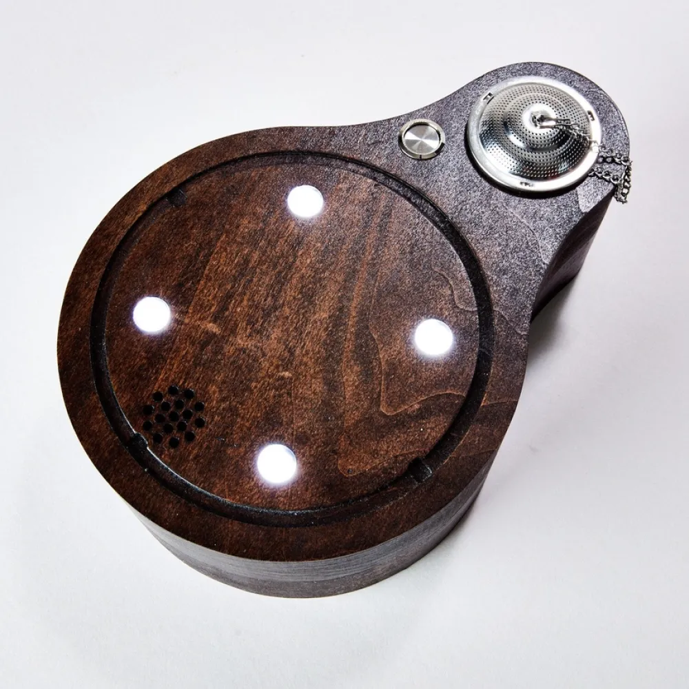 This smoker was designed by me after trying a smoked cocktail at a local bar. It is controlled by a custom circuit board with integrated LEDs.